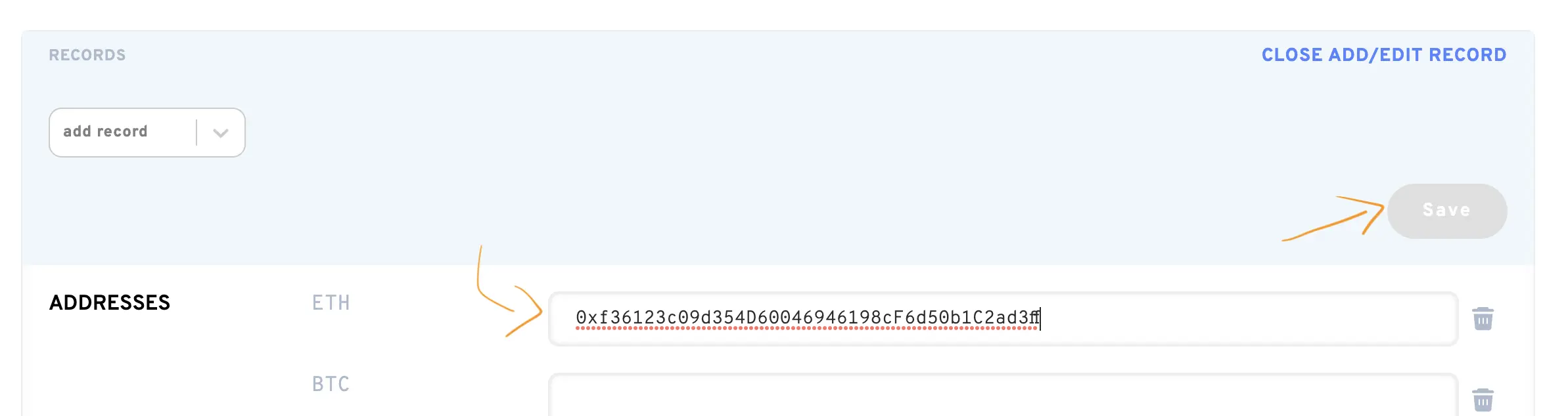 Click Add/Edit Record, paste the payment address you generated into the Addresses: ETH input. Click save and confirm the transaction in your wallet.