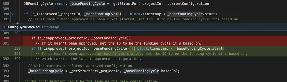 So at this point, something is for sure up or at least not served correctly or the front end isn’t interpreting correctly. That’s quick to check. The etherscan.io confirmed that the current funding cycle starts at a later day. I went to check the unit tests and there were a bunch of cases that I felt this was trying to cover and still passing. So I tried to create the situation exactly and was still struggling to do so. What ended up being the exact step to follow to recreate the bug which I eventually found was: if you create a funding cycle or configure a funding cycle with a duration and then let it roll over to the next funding cycle without reconfiguring, now you’re in the 2nd funding cycle, now you’re in the 2nd funding cycle of the 1st configuration. Then you configure the subsequent one, and before the current cycle is over, you reconfigure the subsequent one again to override the previous configuration. If you’re in this exact state, the 2nd reconfiguration, instead of being based on the 1st FC which you kinda rolling over onto, will be based on the funding cycle you are going to override.