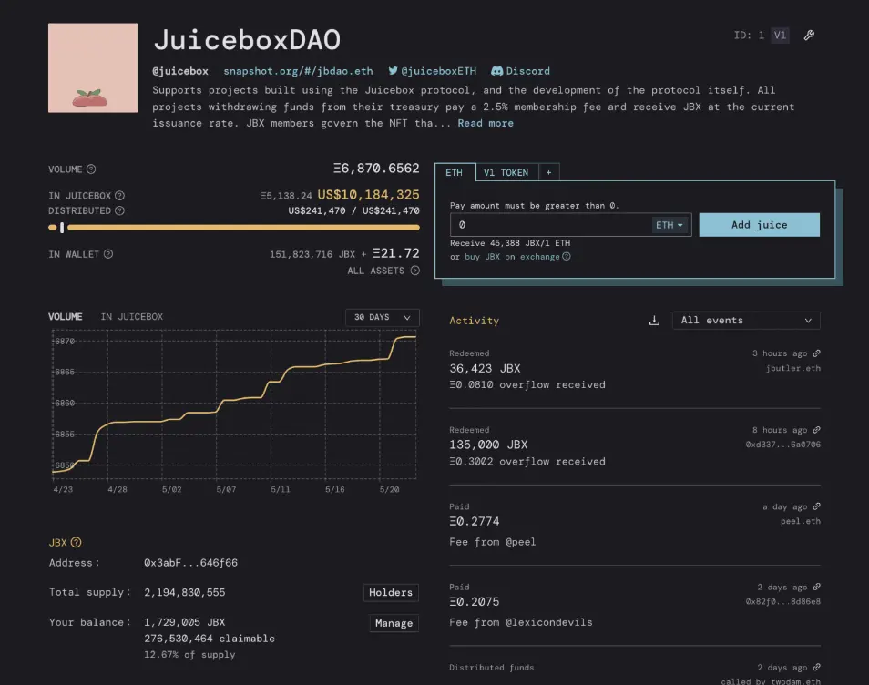@tankbottoms: For things that need to be minted, this area where you can contribute could be a tab where you can mint an NFT. There’s also the idea that makes a kind of landing page for a mint, then there’s also the idea to have a Juicebox marketplace like Jango did. There’s definitely more experimentation where it’s gonna leave. The core ideas are making this tool pretty fancy and giving projects the continuous reasons to get ETH going into the treasury. They don’t have to worry about the whole split thing at some point after they do their NFT thing, like how much you want to go to the treasury or go to your wallet. I think that would be super useful.