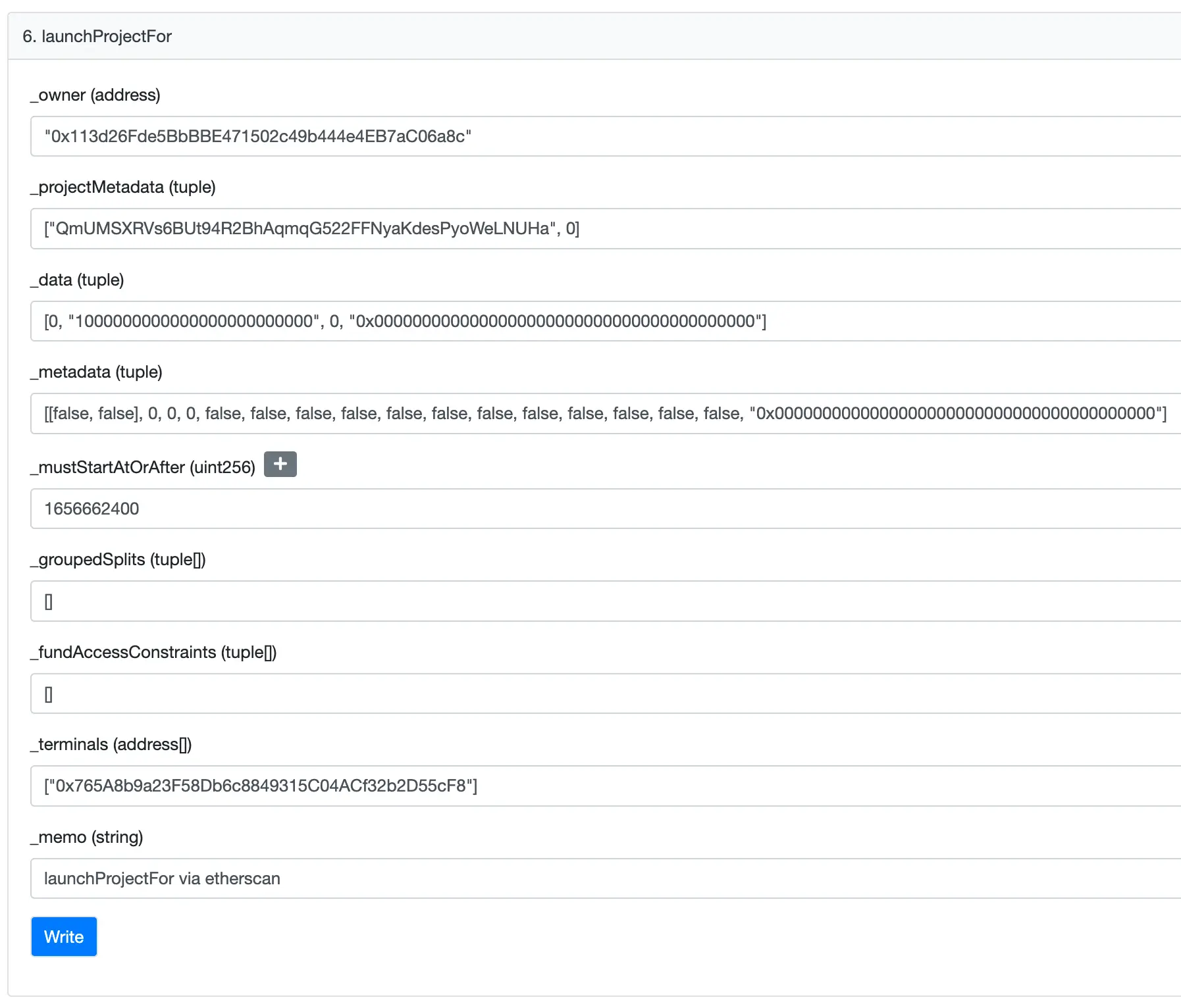1. Visit the JBController3_1 contract on Etherscan here. If not already open, navigate to ContractWrite Contract4. launchProjectFor. Connect your wallet by clicking “Connect to Web3”.