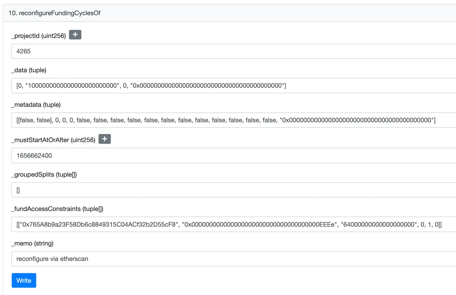 If you are not already familiar with project parameters, read the Programmable treasury guide and the reconfigureFundingCyclesOf docs.